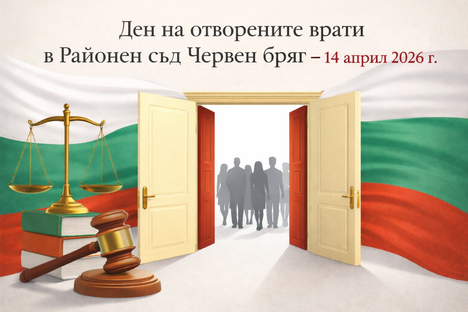 На 14.04.2026 г. Районен съд – Червен бряг ще проведе Ден на отворените врати, посветен на повишаването на правната култура на гражданите и запознаването на обществеността с дейността на съдебната институция.